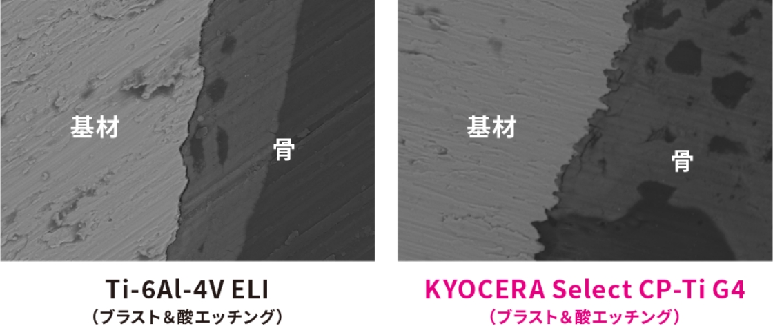 KYOCERA Medical Select CP-Ti G4に『ブラスト&酸エッチング』を施したインプラント体の除去トルク値はTi-6AI-4V ELIに同処理したインプラント体と比較して有意に高く、『ブラスト&HAコーティング』を施したインプラント体と同等の除去トルク値を示しました。
