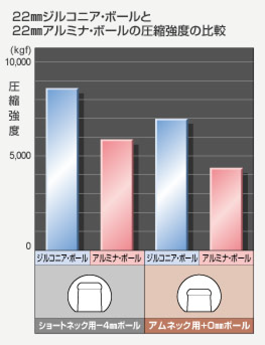 アルミナ骨頭ボールは、その数万例に及ぶ臨床実績により、長期における安全性と有用性が明らかとなりつつあります。アルミナ骨頭ボールは、臨床上充分な強度を有していますが、セラミックスの特性を理解した上での取り扱いが必要であり、セラミック骨頭ボールのさらなる強度の向上は、意義のあるものと考えられます。ジルコニア・ボールは、この製品強度においてアルミナ・ボールの約1.5倍の強度を有していることが確認されました。