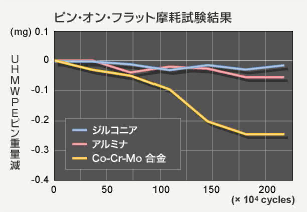 アルミナとジルコニアのポリエチレンに対する摩耗特性を比較検討する目的で、ピン・オン・フラット摩耗試験を実施しました。比較対照は、Co-Cr-Mo合金とし、ポリエチレン・ピンの重量減を測定し摩耗量としました。