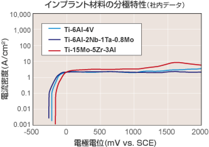 京セラメディカルが開発したバナジウムフリーチタン合金であるTi-15Mo-5Zr-3Al合金及びTi-6Al-2Nb-1Ta-0.8Mo合金の耐食性を検討する目的で、分極試験を実施しました。比較対照は、Ti-6Al-4V合金とし、電流密度を測定しました。