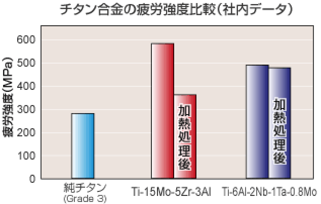 Ti-15Mo-5Zr-3Al合金は、京セラメディカルの医療用材料としてのチタン合金の中で最も高い強度を有しています。しかし、チタンポーラス層形成のための過熱処理を施すことにより、その疲労強度はTi-6Al-2Nb-1Ta-0.8Mo合金よりも低下します。そのため、Ti-15Mo-5Zr-3Al合金はセメンテッドタイプのインプラントに採用されています。