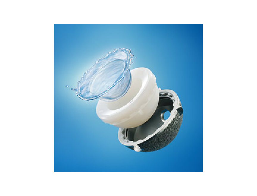 Aquala(アクアラ)は、細胞膜と同じ分子構造を持つ「MPCポリマー」を人工股関節摺動面(関節面)にグラフト重合させることに成功した、日本発の技術です。 関節軟骨と同様の表面構造を構築するというバイオミメティック(生体模倣)技術を活用することにより、人工股関節のゆるみの主因である「摩耗粉の産生」と「摩耗粉による骨吸収の誘導」を同時に抑制することが示唆されました。15年分以上に相当する歩行負荷試験では、摩耗粉の産生が従来の製品(当社製品との比較)と比べ約99%抑制され、人工股関節の耐用年数を大きく延ばすことが期待できます。