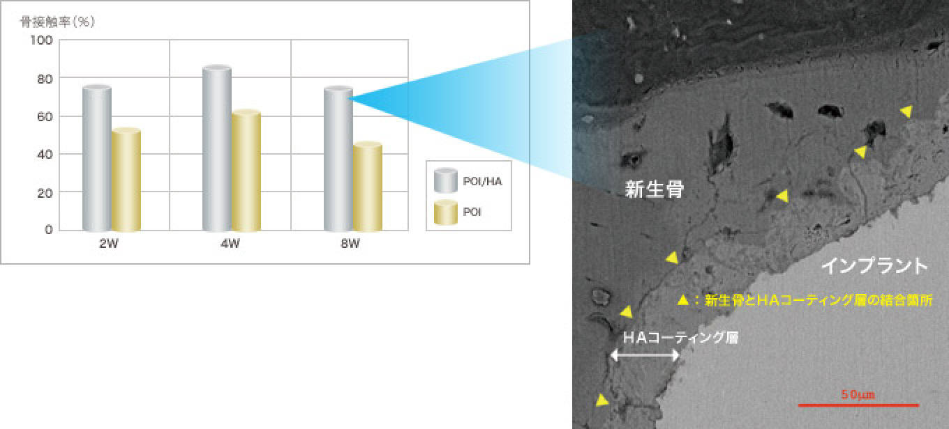 HAコーティングされたチタン製フィクスチャーは、陽極酸化処理されたチタン製フィクスチャーに比べ、埋入後2週、4週、8週いずれにおいても接触面積率が高いことがわかります。8週のSEM画像からも石灰化の進んだ緻密な新生骨がHAコーティング層が充分に結合しているのが確認されました。